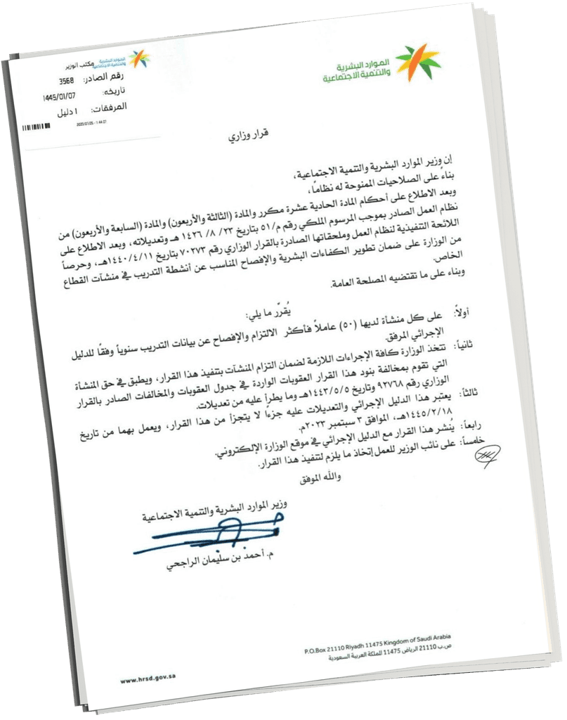 السعودية برقم 3568 وينص على : أي منشأة تضم 50 موظفًا أو أكثر مُلزمة سنويًا بتدريب موظفيها والإفصاح عن نتائج التدريب بوضوح. وعدم الالتزام؟ يعني دخول شركتك في دائرة الغرامات والمخالفات طبقًا للائحة العقوبات الرسمية.